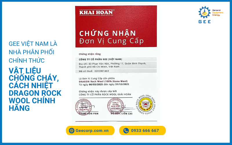 GEE Việt Nam tự hào được Khải Hoàn chứng nhận là nhà phân phối chính thức bông đá Dragon Rockwool tại thị trường Việt Nam. Điều này đồng nghĩa khách hàng luôn nhận được nguồn vật tư chính hãng, tiêu chuẩn kỹ thuật minh bạch và giá trị sử dụng bền vững theo đúng khuyến nghị của nhà sản xuất. Nếu bạn đang tìm kiếm giải pháp cách nhiệt, chống cháy chất lượng cao cho công trình, hãy liên hệ GEE Việt Nam để được tư vấn và cung cấp hàng chuẩn với dịch vụ uy tín, nhanh chóng và an toàn.