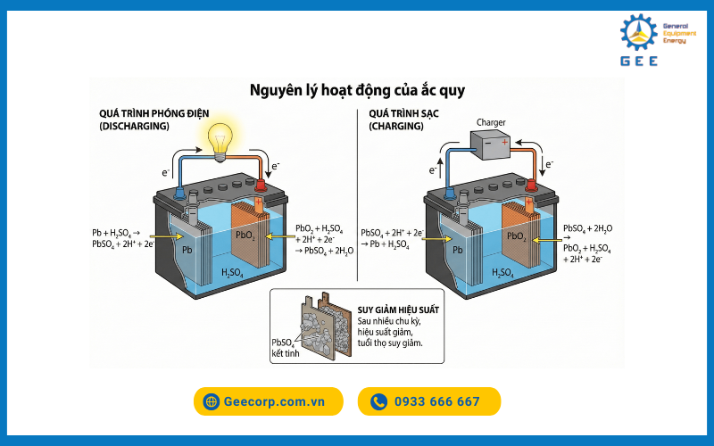 Nguyên lý hoạt động của ắc quy axit-chì của xe nâng điện.