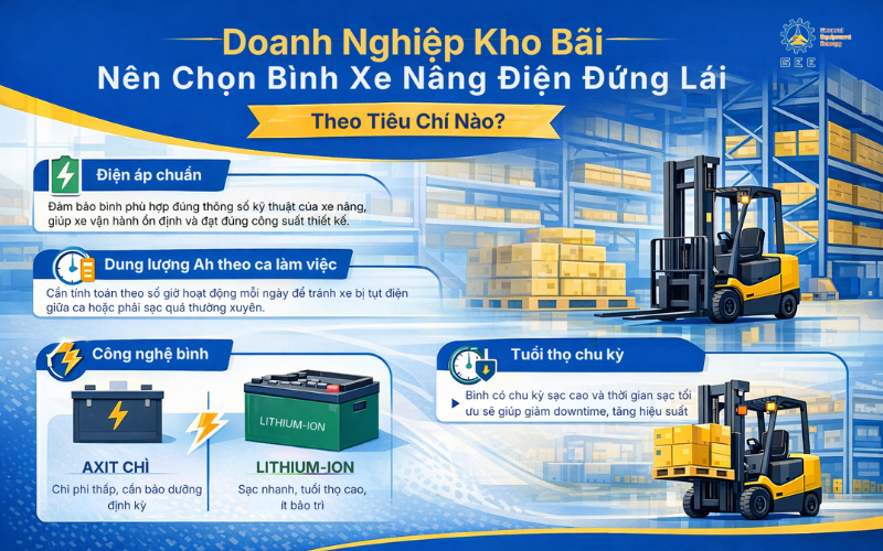 Doanh nghiệp kho bãi nên chọn bình xe nâng điện đứng lái theo các tiêu chí quan trọng sau để đảm bảo vận hành ổn định và tối ưu chi phí dài hạn: