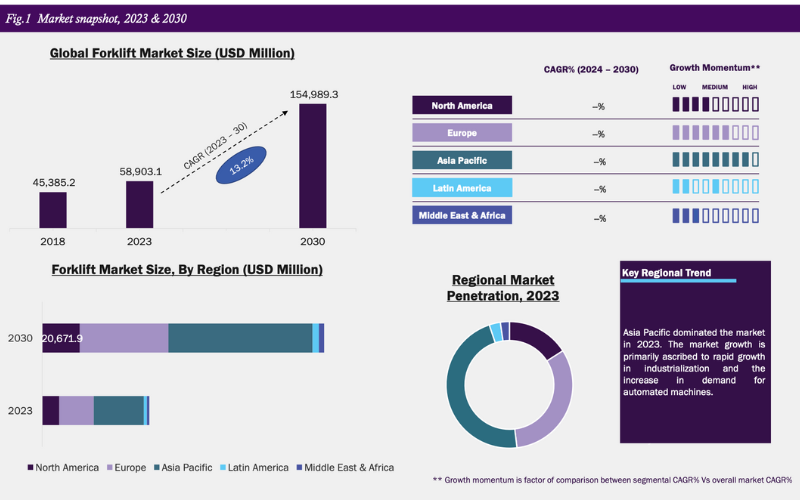 Quy mô thị trường xe nâng toàn cầu giai đoạn 2023-2030. Nguồn: Grand View Research.