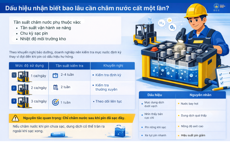 Theo khuyến nghị bảo dưỡng, doanh nghiệp nên kiểm tra mực nước định kỳ thay vì đợi đến khi pin có dấu hiệu hư hỏng. Bảng dưới đây giúp người vận hành xác định chu kỳ kiểm tra nước phù hợp theo cường độ sử dụng xe nâng.