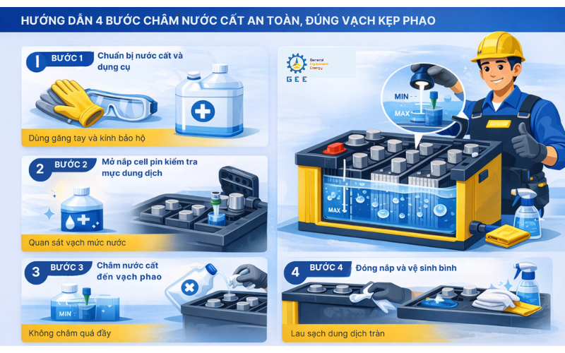 Một nguyên tắc quan trọng trong bảo dưỡng: Chỉ châm nước sau khi pin đã sạc đầy. Nếu châm nước khi pin chưa sạc, dung dịch có thể tràn ra ngoài khi sạc xong