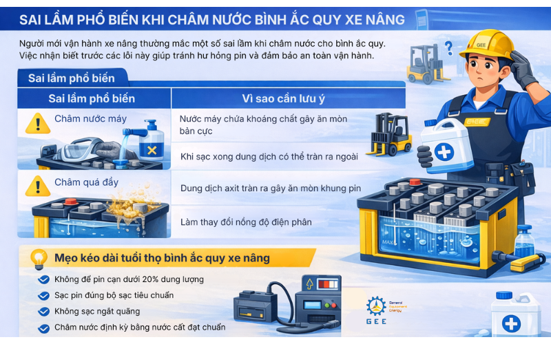 Người vận hành xe nâng mới thường mắc một số sai lầm khi châm nước cho bình ắc quy. Việc nhận biết trước các lỗi này giúp tránh hư hỏng pin và đảm bảo an toàn vận hành.
