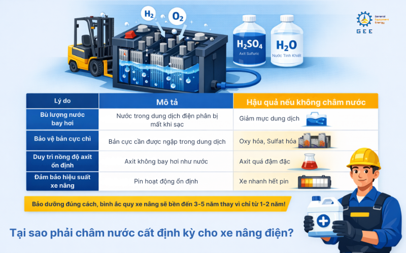 Để giúp người vận hành dễ hình dung, bảng dưới đây tóm tắt các lý do chính cần châm nước cất định kỳ cho bình ắc quy xe nâng.