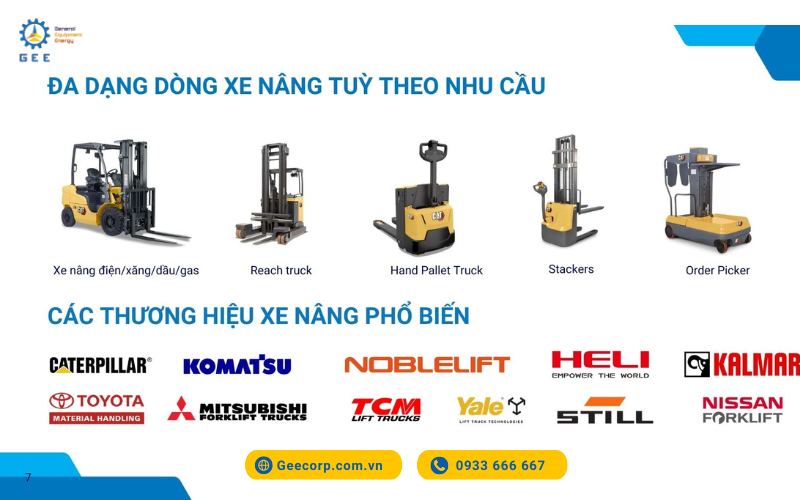GEE Việt Nam tự hào là đối tác đáng tin cậy, chuyên cung cấp các giải pháp xe nâng hàng đầu tại thị trường Việt Nam và khu vực Đông Nam Á. Với kinh nghiệm và sự am hiểu sâu sắc về ngành thiết bị nâng hạ, chúng tôi cung cấp đầy đủ các dòng xe nâng từ tất cả các thương hiệu uy tín được đề cập trong bài viết này - từ những thương hiệu Nhật Bản nổi tiếng về độ bền như Toyota, Komatsu, Mitsubishi, đến các dòng xe công nghệ cao từ Châu Âu/Mỹ như CAT, Jungheinrich, Still, hay các lựa chọn tối ưu chi phí từ Heli, Noblelift.