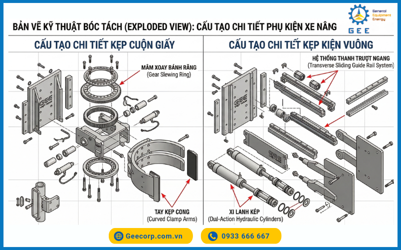 | Thành phần cấu tạo | Cấu trúc Bộ kẹp cuộn giấy | Cấu trúc Bộ kẹp kiện vuông |