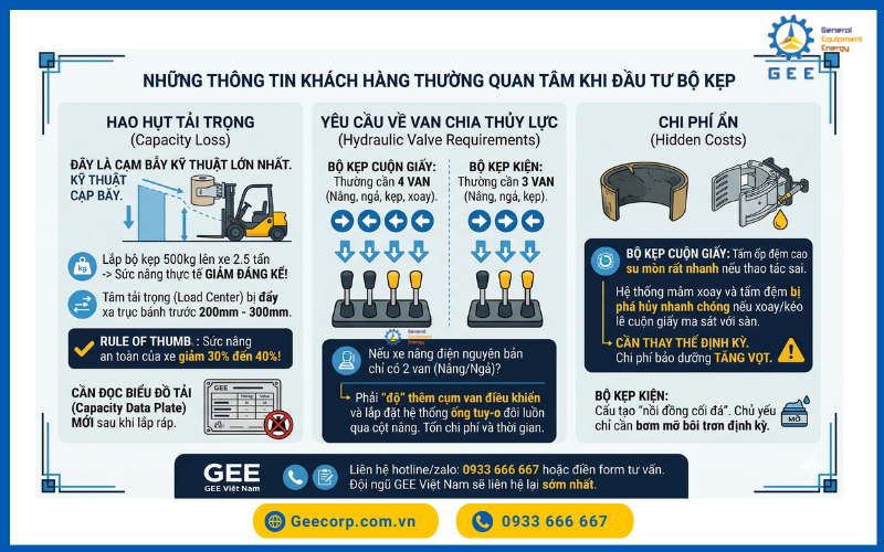 Tải trọng thực tế sẽ giảm đi đáng kể do tự trọng của bộ kẹp (thường từ 400kg - 800kg) và việc tâm tải trọng bị đẩy ra xa hơn phía trước. Bạn cần cung cấp thông số xe cho GEE Việt Nam, chúng tôi sẽ dùng phần mềm tính toán Load Center để đưa ra mức tải trọng nâng an toàn chính xác nhất cho bạn.