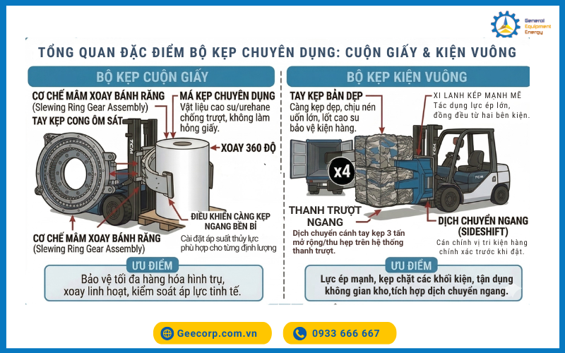 Tổng quan đặc điểm của bộ kẹp cuộn giấy và bộ kẹp kiện vuông.