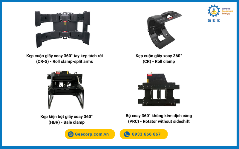 - Phụ kiện chuyên dụng: Các phụ kiện ngành giấy như kẹp cuộn giấy lớn, bộ kẹp kiện phế liệu (CAM, Cascade, Bolzoni, Longhe) giúp tối ưu vận hành, giảm hư hỏng sản phẩm và tăng hiệu suất.
