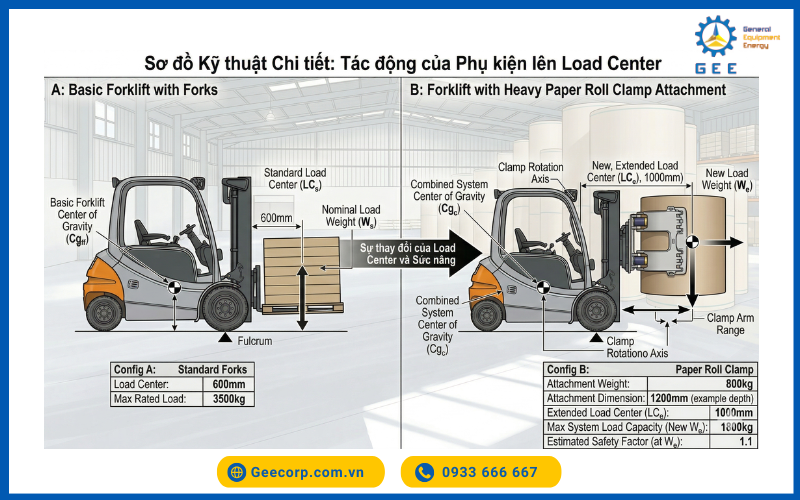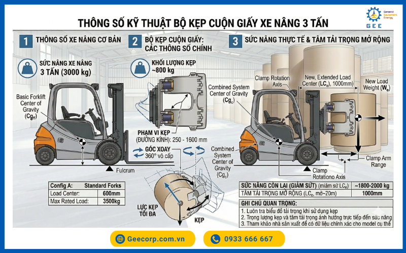 Một chiếc xe nâng 3 tấn cơ bản khi lắp thêm bộ kẹp (thường nặng từ 500kg đến 700kg) sẽ làm dịch chuyển tâm tải trọng, khiến sức nâng an toàn thực tế chỉ còn khoảng 1.8 tấn đến 2.2 tấn. Doanh nghiệp cần cung cấp thông số chính xác về đường kính và trọng lượng cuộn giấy để kỹ thuật viên tại GEE Việt Nam tính toán và tư vấn mã kẹp phù hợp nhất.