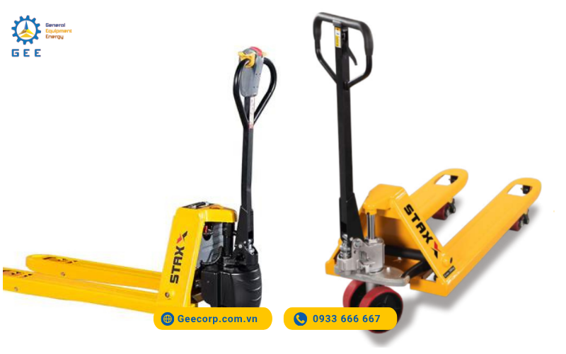 Xe nâng tay thủy lực dùng sức người, giá rẻ – phù hợp kho nhỏ. Xe nâng tay điện có motor hỗ trợ, phù hợp kho lớn, giảm sức lao động.