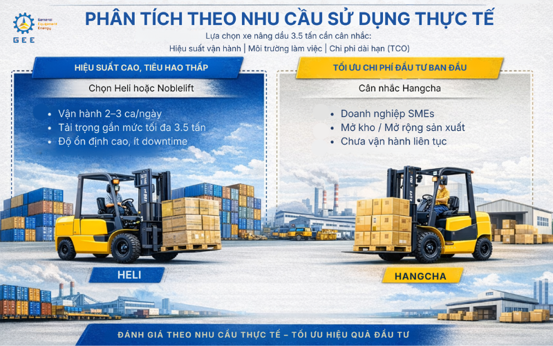 Khi lựa chọn xe nâng dầu 3.5 tấn, doanh nghiệp không nên chỉ so sánh giá bán ban đầu mà cần phân tích theo cường độ vận hành, môi trường làm việc và mục tiêu chi phí dài hạn (TCO). Dưới đây là phân tích cụ thể theo từng nhóm nhu cầu thực tế trong kho bãi – nhà máy – bãi container.