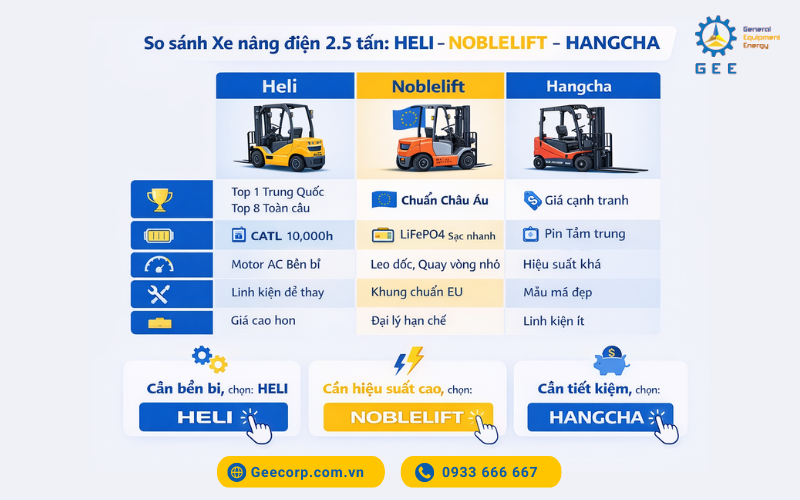 Bài viết dưới đây, GEE Việt Nam sẽ phân tích chi tiết hiệu suất, độ bền pin, chi phí và khả năng thích nghi của từng dòng xe để giúp bạn chọn được mẫu xe nâng điện 2.5 tấn tối ưu nhất cho doanh nghiệp.