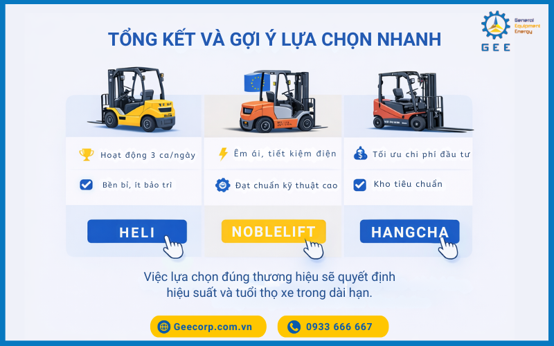 So sánh chi tiết 3 thương hiệu hàng đầu: Heli – Noblelift – Hangcha