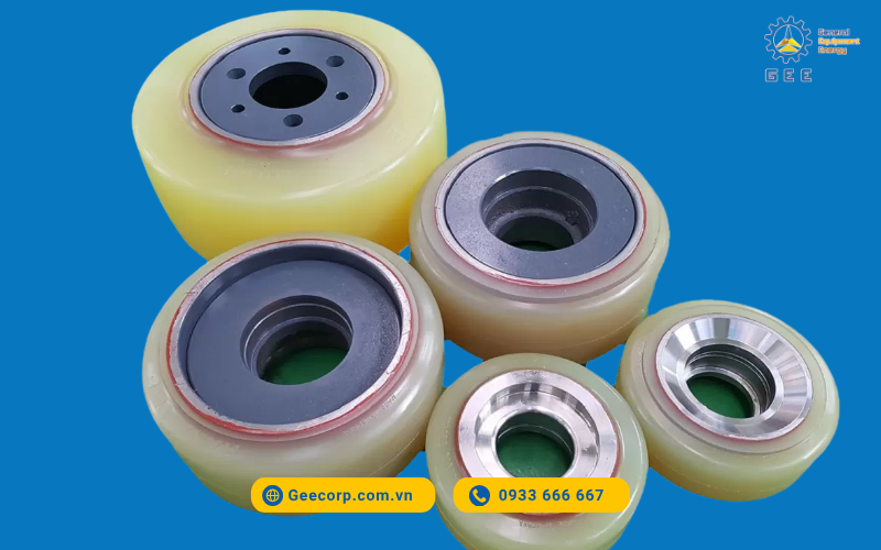 Thường sử dụng PU (Polyurethane) hoặc Nylon, tùy theo loại mặt sàn. PU êm và bám tốt hơn, phù hợp với sàn epoxy hoặc sàn trơn. Nylon cứng, chống mài mòn tốt, phù hợp với nền bê tông hoặc sàn gồ ghề.