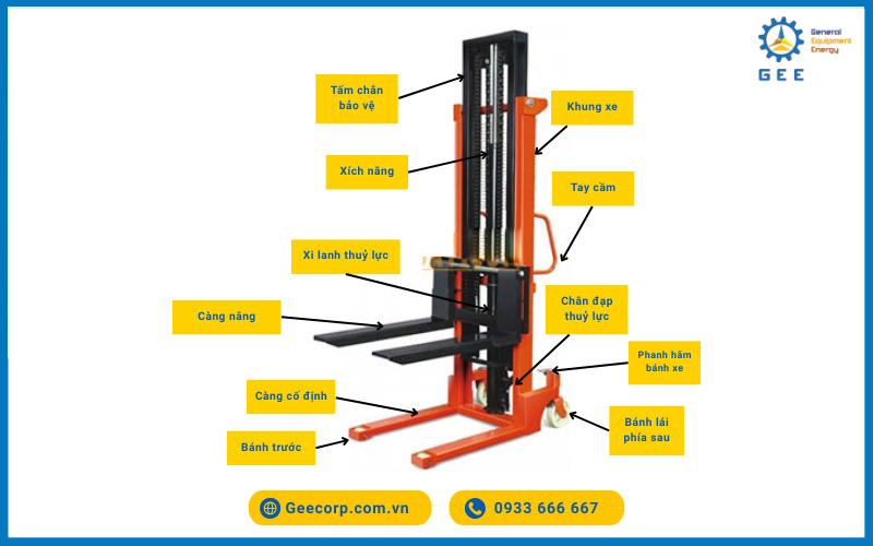 Xe nâng tay cao hoạt động chủ yếu dựa trên nguyên lý thủy lực và cơ cấu nâng hạ bằng tay. Dưới đây là các bộ phận chính cấu thành nên thiết bị: