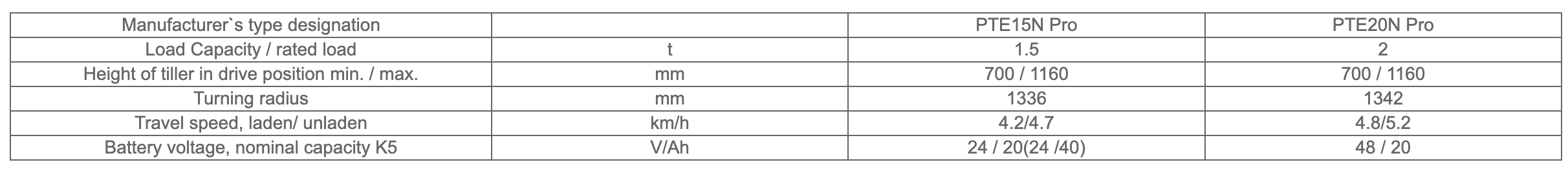 Thông tin kỹ thuật xe nâng tay điện Lithium Noblelift PTE15/20N Pro (1.5 - 2 Tấn):