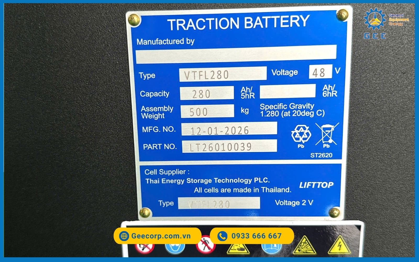 Ắc quy Lifttop 48V – 280Ah mới được lắp đặt đúng vị trí theo thiết kế của xe nâng. Sau khi lắp đặt, kỹ thuật viên kiểm tra kỹ hệ thống dây dẫn, đầu nối và các điểm tiếp xúc, đảm bảo kết nối chắc chắn, đúng kỹ thuật và tương thích hoàn toàn với xe, giúp xe vận hành ổn định và an toàn.