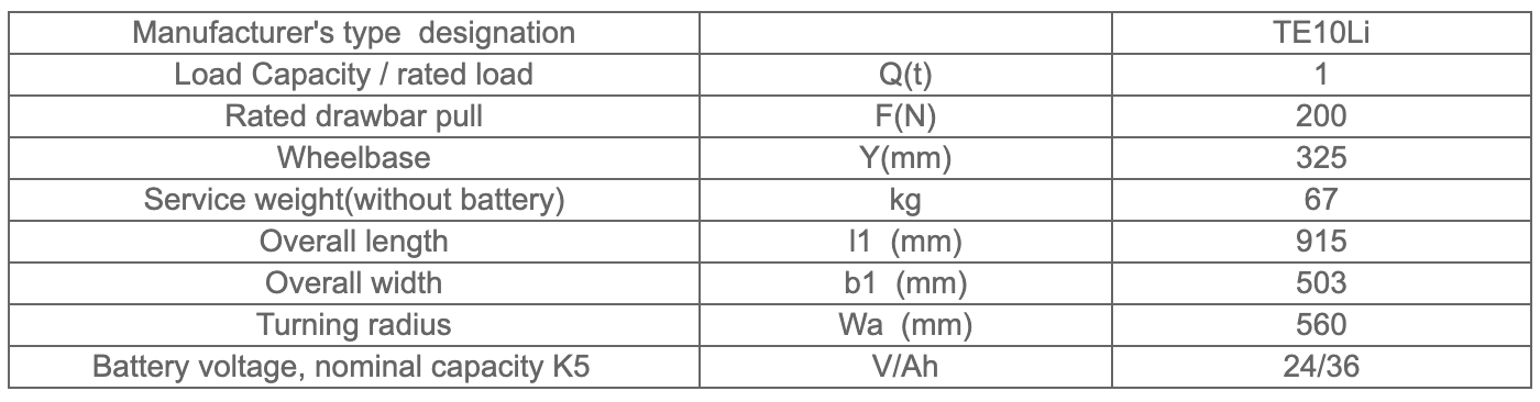 Thông số kỹ thuật xe kéo điện Tow Truck Noblelift TE10li (1 Tấn):
