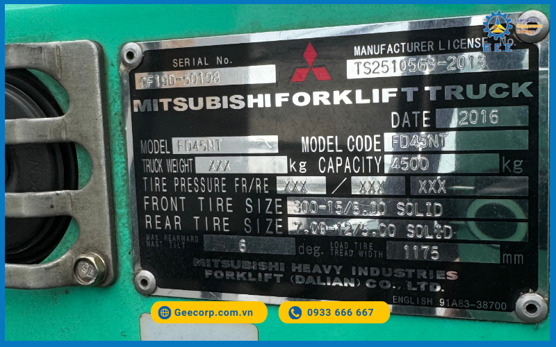 Thông số kỹ thuật của Xe nâng dầu Mitsubishi 4.5 tấn đã qua sử dụng: