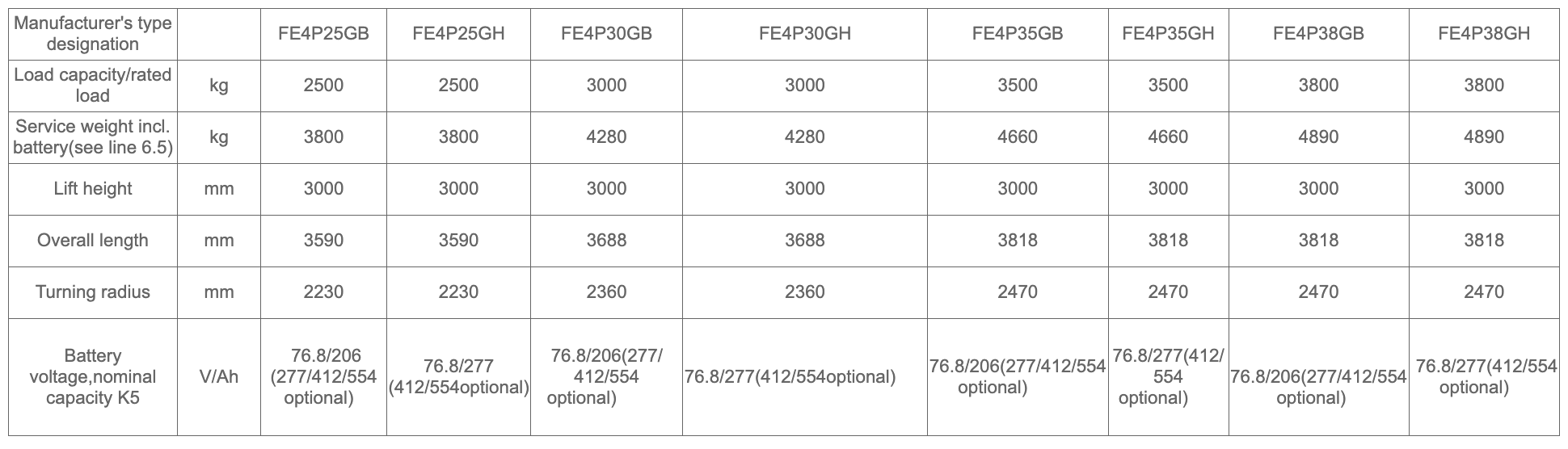 Thông số kỹ thuật xe nâng điện Lithium Noblelift FE4P25/38GB (2.5 - 3.8 Tấn)