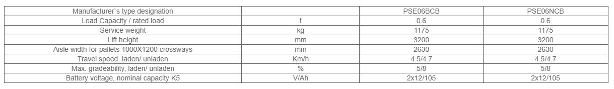 - Chiều cao nâng: 3200 mm (cho cả PSE068CB và PSE06NCB)