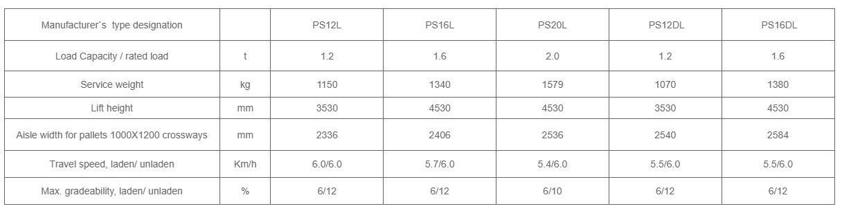 Thông số kỹ thuật xe nâng điện Stacker Noblelift PS12-20L (1.2 - 2 Tấn):