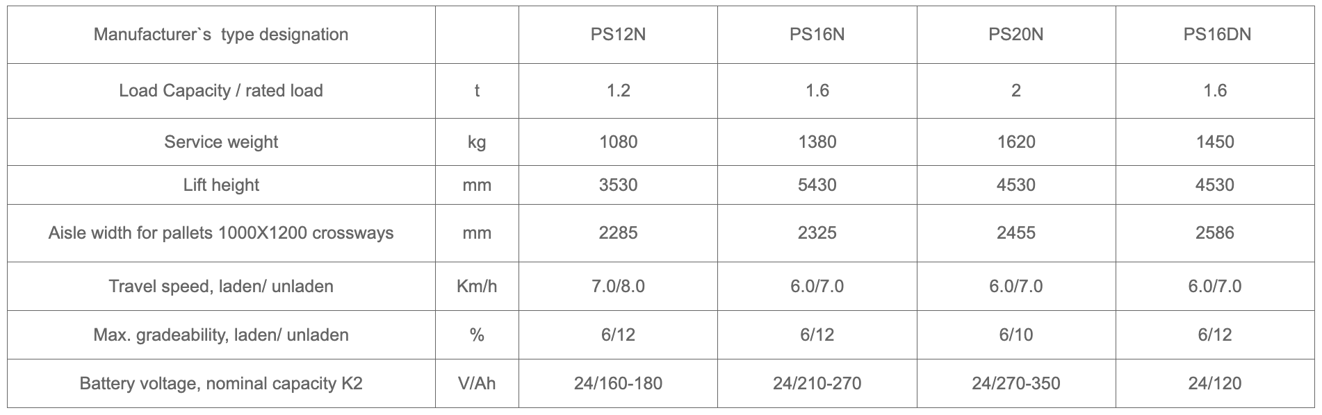 Thông số kỹ thuật xe nâng điện Stacker Noblelift PS12-20N (1.2 - 2 Tấn)