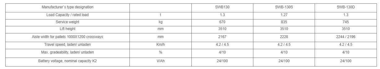 Thông số kỹ thuật xe nâng điện Stacker Noblelift SWB-130 (1.3 Tấn):