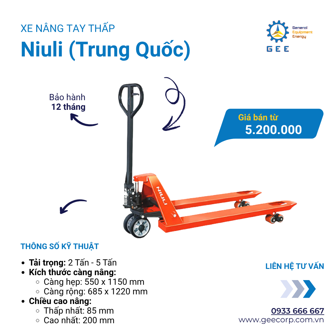 Niuli là thương hiệu nổi tiếng về thiết bị nâng hạ, đặc biệt là xe nâng tay thủy lực. Sản phẩm của Niuli được biết đến với độ bền, dễ sử dụng, và hệ thống bơm thủy lực chất lượng cao, phù hợp cho việc di chuyển hàng hóa trên nhiều loại pallet trong kho bãi và nhà xưởng.